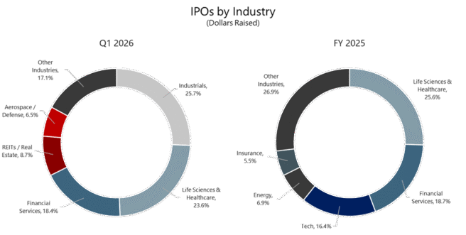 According to Wolters Kluwer, companies raised over $41 billion in IPO proceeds in 2025, surpassing the almost $30 billion raised in 2024. IPOs raised over $9.6 billion in proceeds in the first quarter of 2026, an almost 15% increase from the first quarter of 2025. As seen in the graphic below, companies in the life sciences and healthcare, financial services, and industrials sectors lead the market in IPO proceeds.